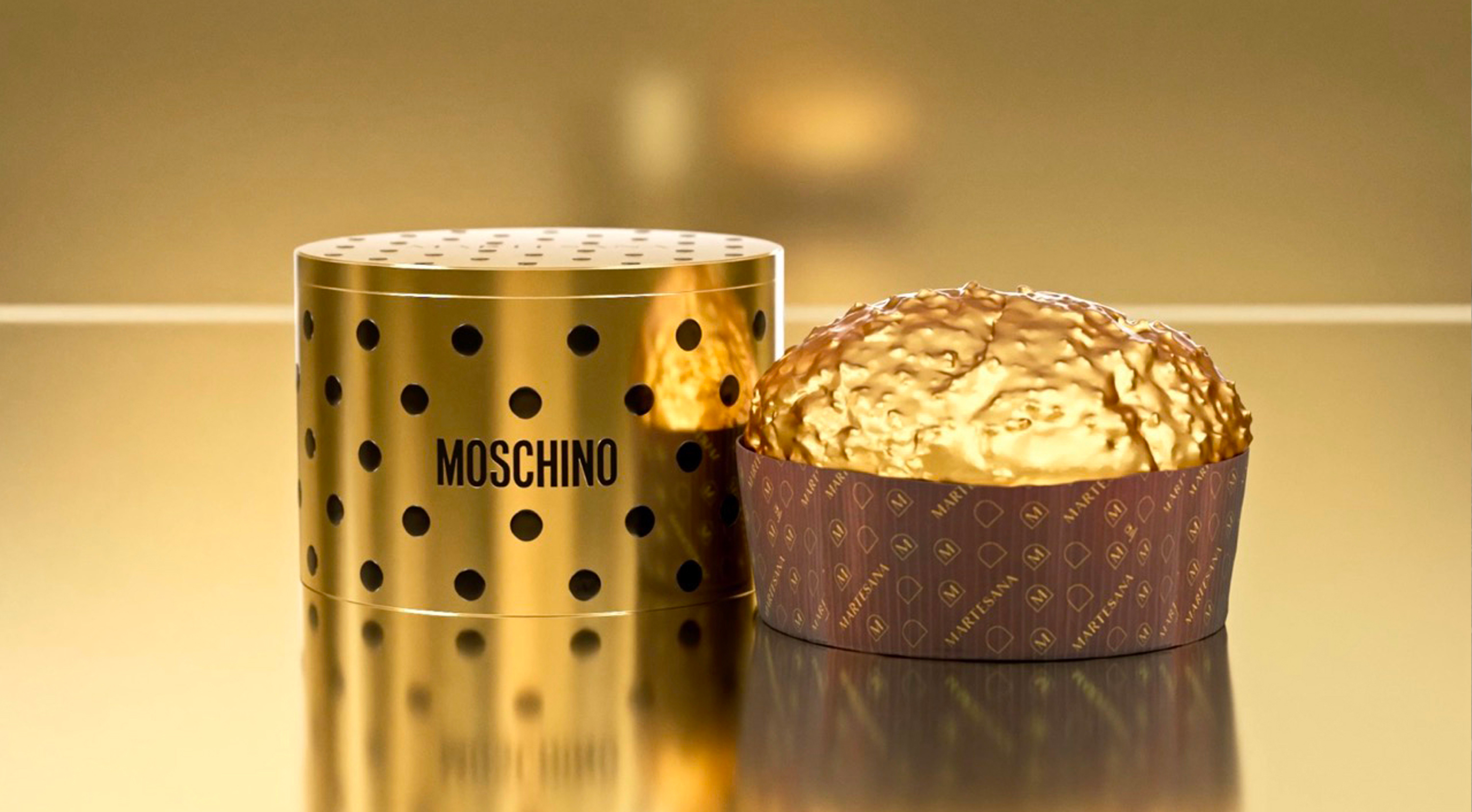 For the Panettone d’Oro 2025, Moschino and Martesana renewed their collaboration to elevate the traditional panettone into a refined couture object. Born in 2023 and crafted by the pastry chefs of Alta Pasticceria di Quartiere, the Panettone d’Oro returns as a limited-edition collectible, enclosed in a precious golden tin hatbox adorned with Moschino’s iconic black polka dots.